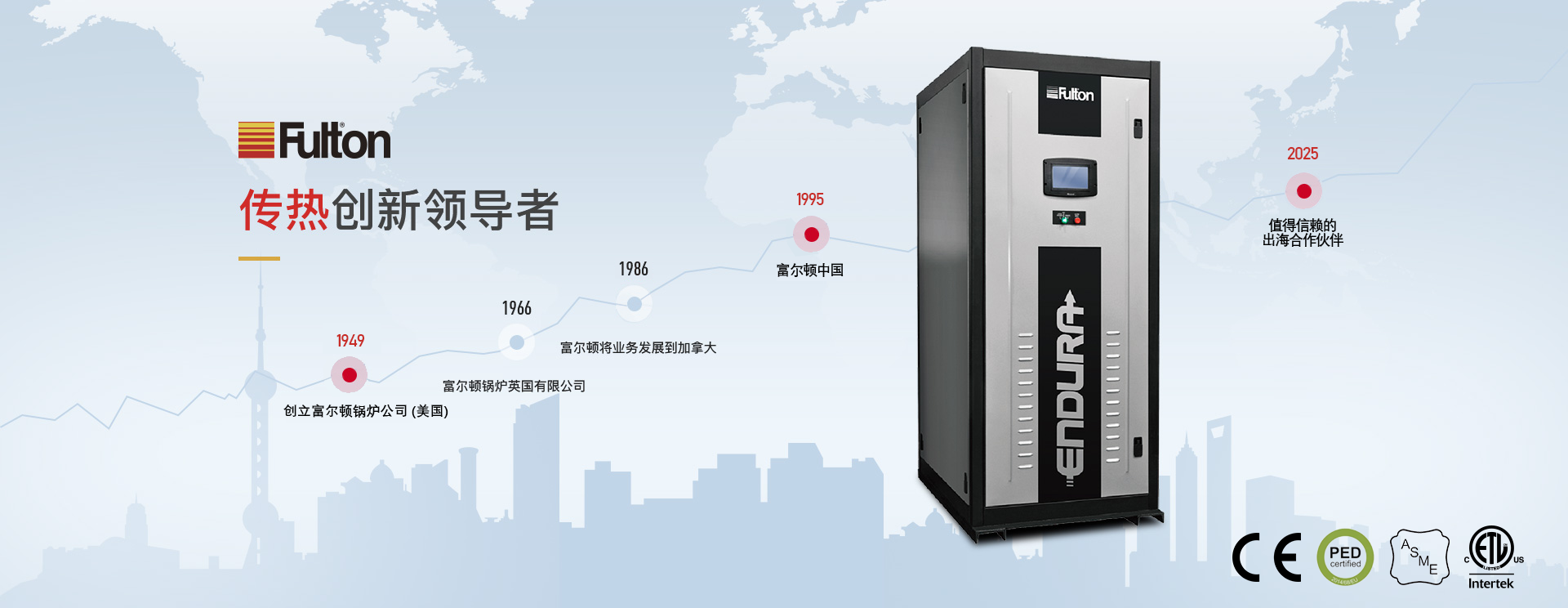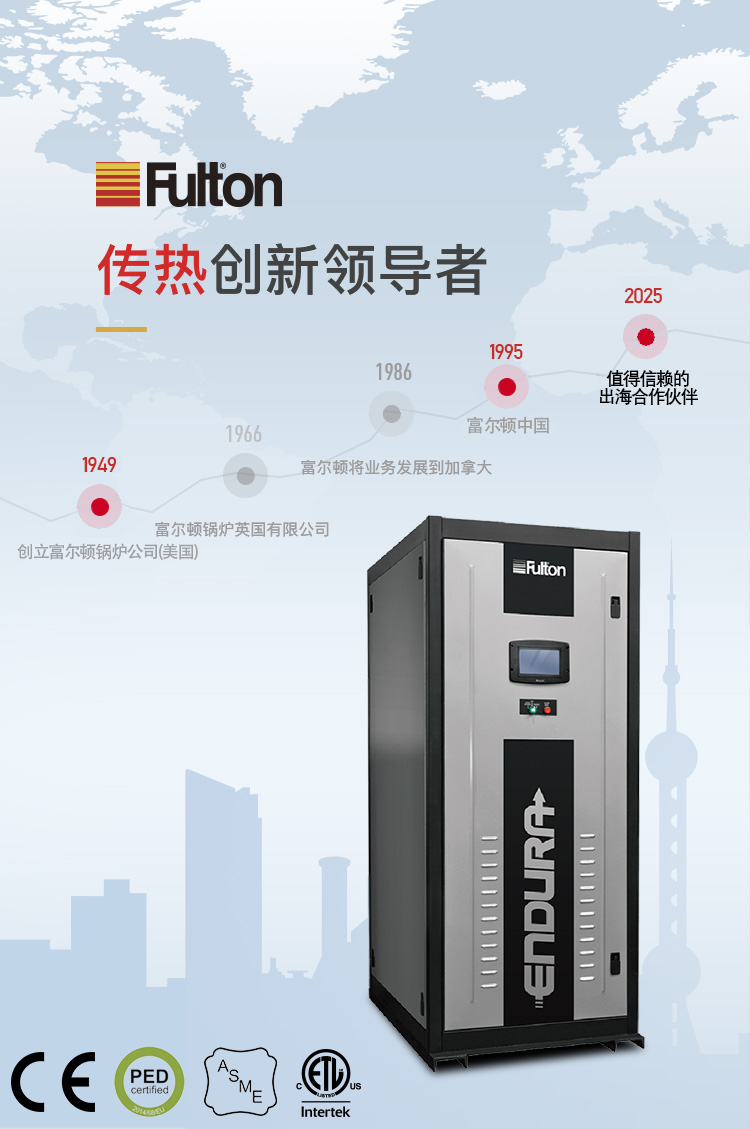 富爾頓是國際著名的跨國高質(zhì)量傳熱產(chǎn)品制造商,具有七十多年的專業(yè)設(shè)計、制造、銷售鍋爐的經(jīng)驗(yàn),是立式無管鍋爐和脈沖燃燒鍋爐的發(fā)明者,幾十年來一直領(lǐng)導(dǎo)世界鍋爐新潮流。